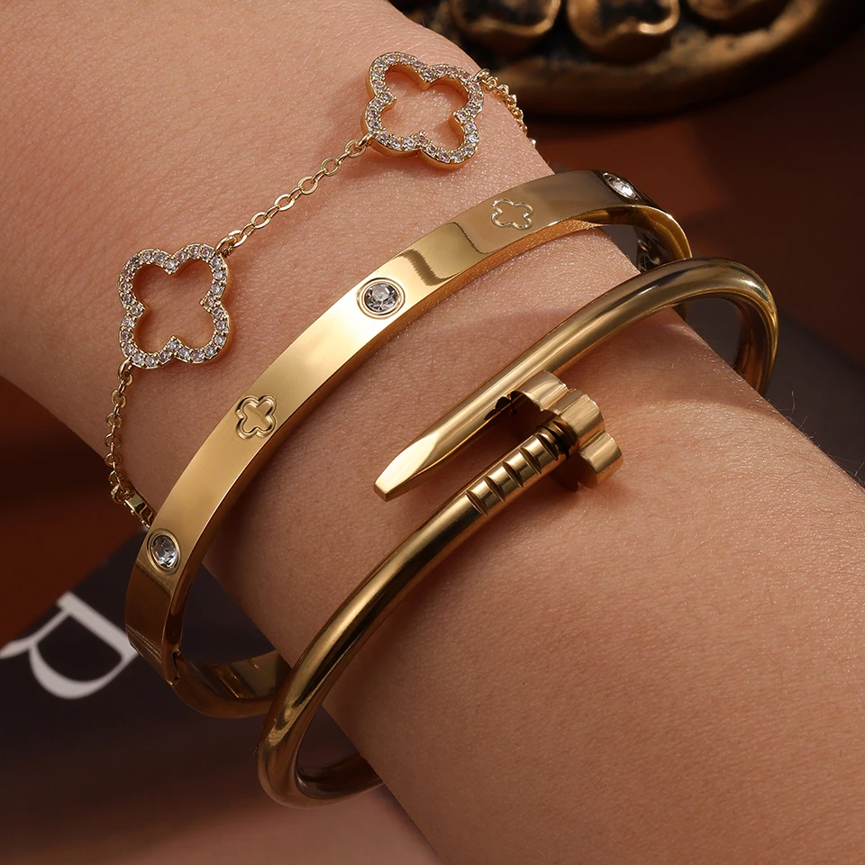 3Pcs Stainless Steel 18K Gold Plated Four-Leaf Flower Nails Stacked Bracelet Bangles Shiny Zircon Couple Jewelry Gift