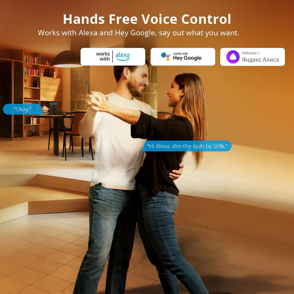 Our smart led light bulbs are compatible with Yandex Alice,Amazon Alexa,Google Assistant for easy voice control.Just control it via your voice to turn on/off or dim/brighten your light, even switch your light to specific color as you desired.No hub required and easy to install.NOTE:WiFi smart led light bulb only supports 2.4 GHz Wi-Fi network.